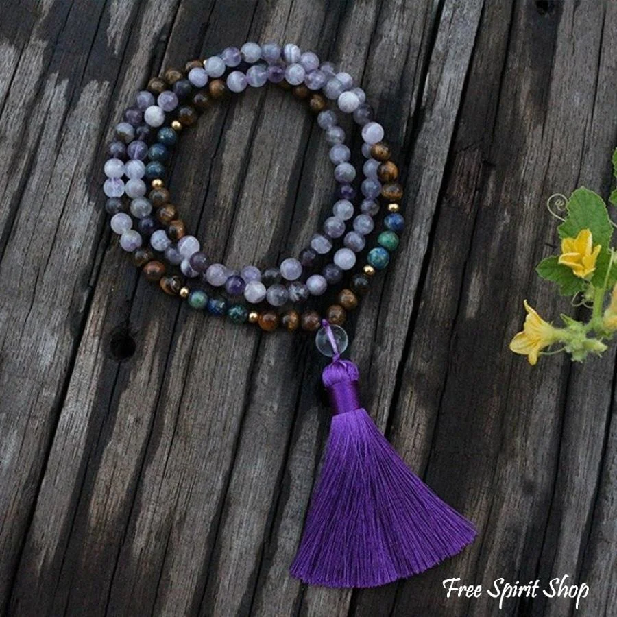 108 Natural Amethyst Crazy Lapis & Tiger Eye Gemstone Bead Mala Necklace